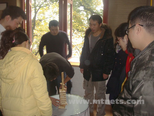 當(dāng)然,這并不與年輕的明通主管們的熱情和活躍相沖突,歡聲笑語時不時的從山中的樓閣飄向霧氣朦朦的西湖和斷橋,延綿伸展,溫暖著水面的寒氣。疊疊高比賽調(diào)動了所有人指尖的靈敏,呼吸和思維會在取木塊的時候停止,掌聲歡呼、失落嘆息又會在一剎那間爆發(fā)。習(xí)慣了比賽的他們,在任何時候面臨都會認真對待,場景何其壯觀,競爭即游戲,游戲即競爭,誰是最后的勝利者,游戲中所有的參與者都是,呵呵......